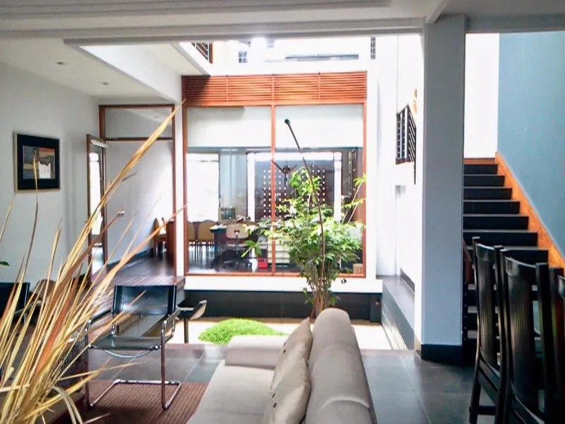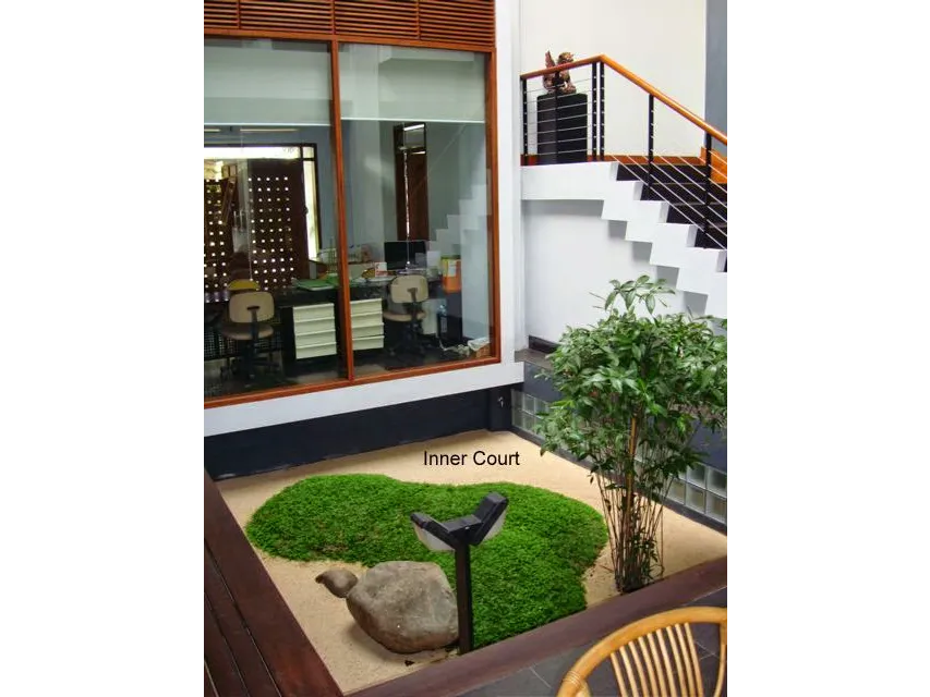 Dibangung diatas tanah dengan ukuran 8x25. Kantor dan rumah tinggal dipisahkan oleh taman kering dan vide. Antara kantor dan rumah hanya dipisahkan oleh kaca yang besar, sehingga menimbulkan kesan yang luas pada rumah ini.