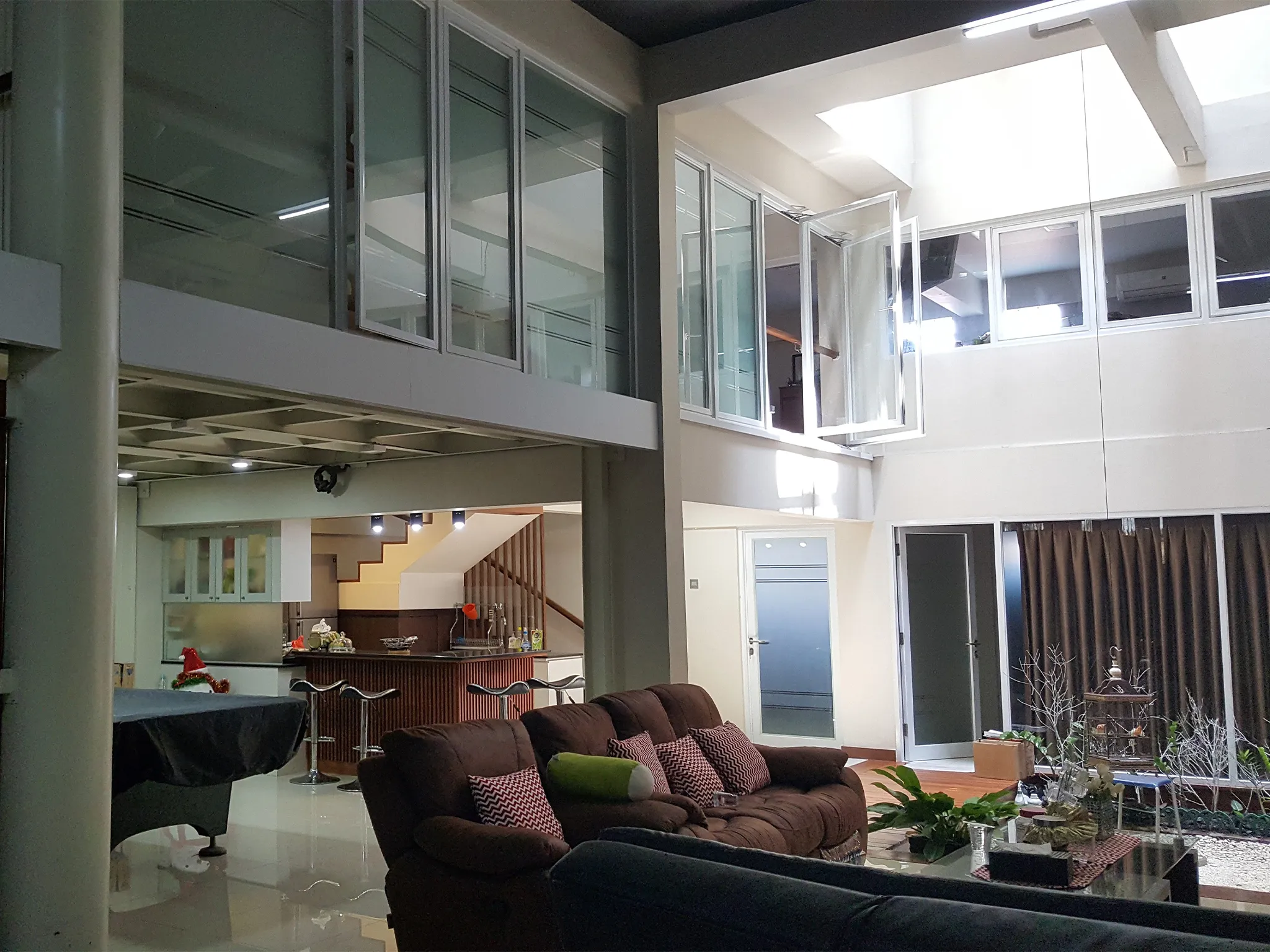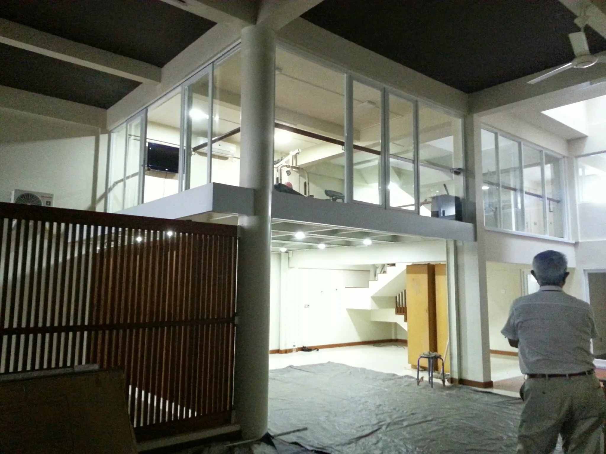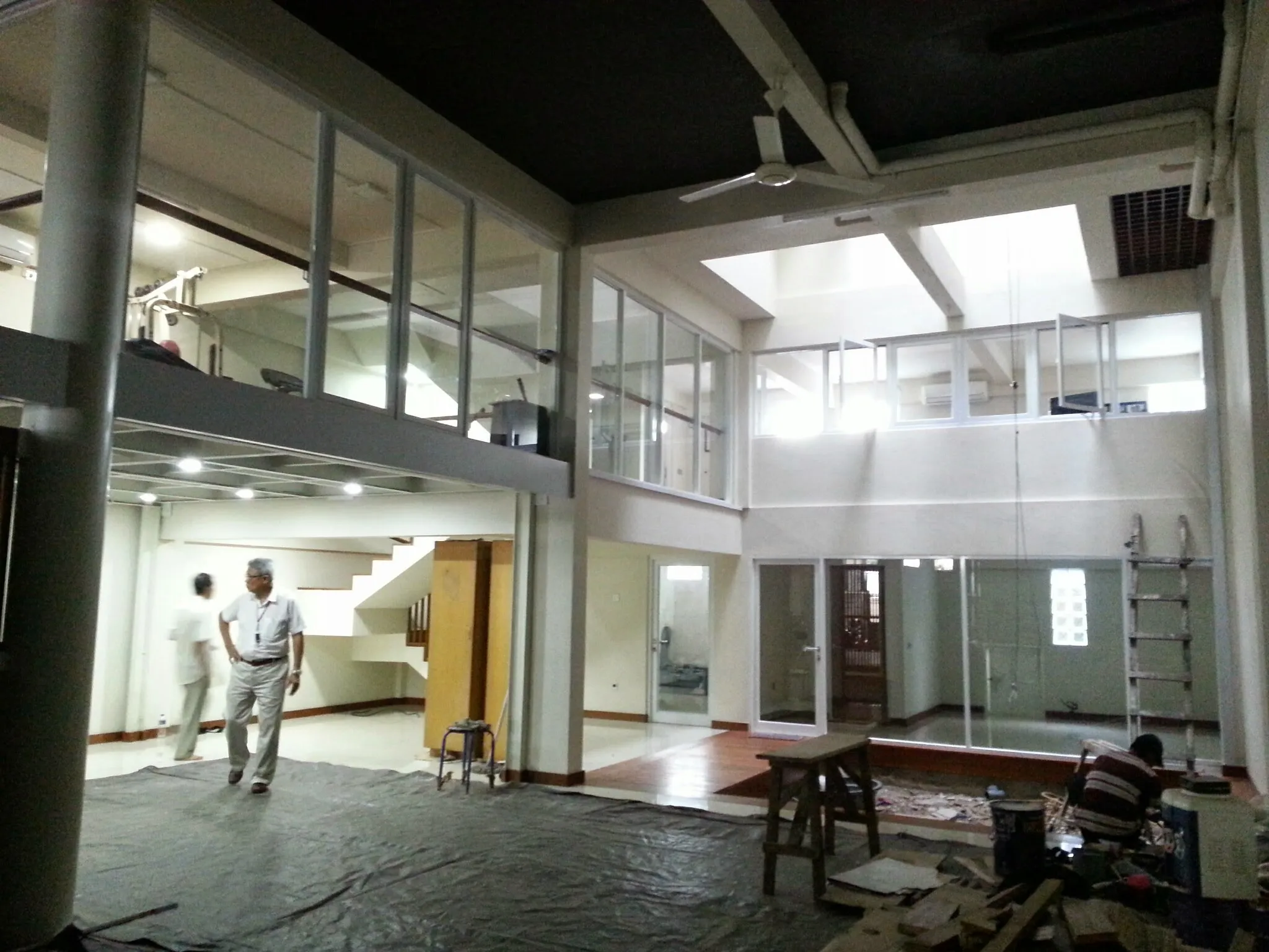 Proyek renovasi rumah tinggal 2 lantai di Jl. Suryani, Bandung.Didesain dengan membongkar satu area lantai yang membentuk vide, sehingga cahaya matahari bisa masuk sampai ke lantai bawah. Lantai bawah memiliki plafon yang tinggi maka bisa dibuat mezanin untuk kantor dan ruang fitness.
